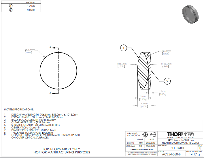Thorlabs索雷博 AC254-050-B 消色差双胶合透镜