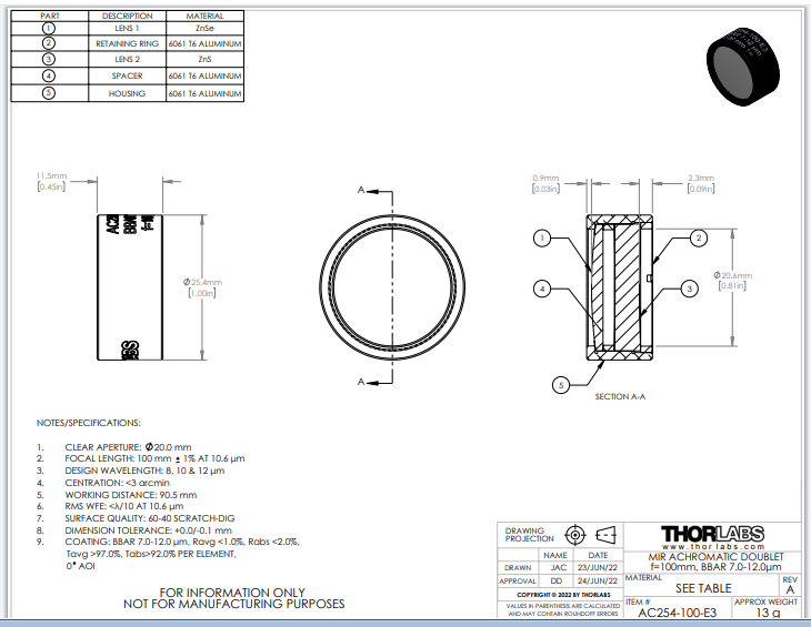 Thorlabs索雷博 AC254-100-E3 空气隙消色差双合透镜