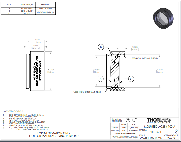 Thorlabs索雷博 AC254-100-A-ML 消色差双胶合透镜