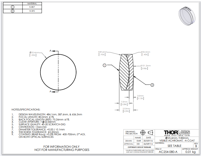 Thorlabs索雷博     AC254-080-A   消色差双胶合透镜