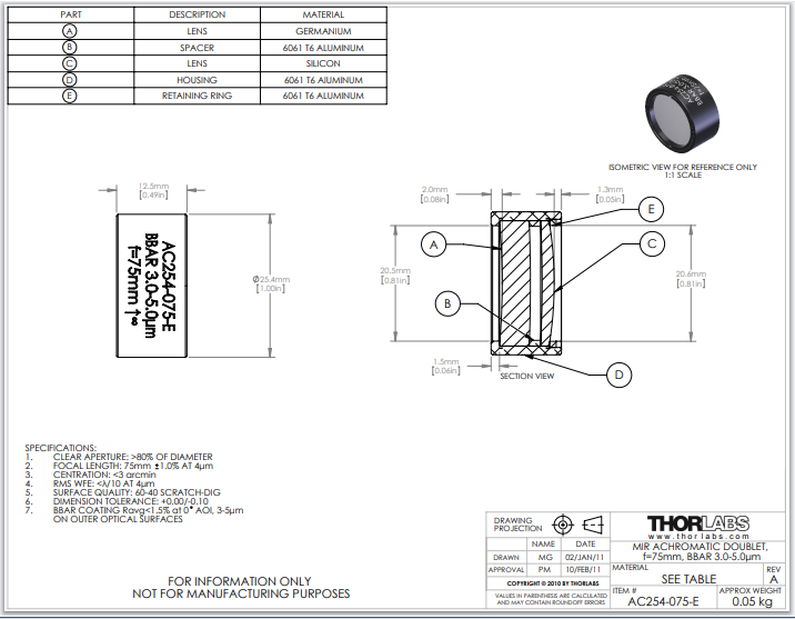 Thorlabs索雷博     AC254-075-E   空气间隔消色差胶合透镜