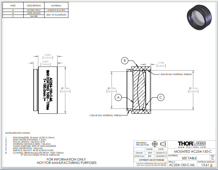 Thorlabs索雷博     AC254-150-C-ML   消色差双胶合透镜