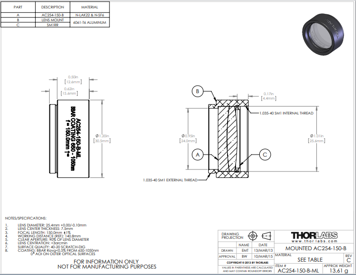 Thorlabs索雷博 AC254-150-B-ML 消色差双胶合透镜