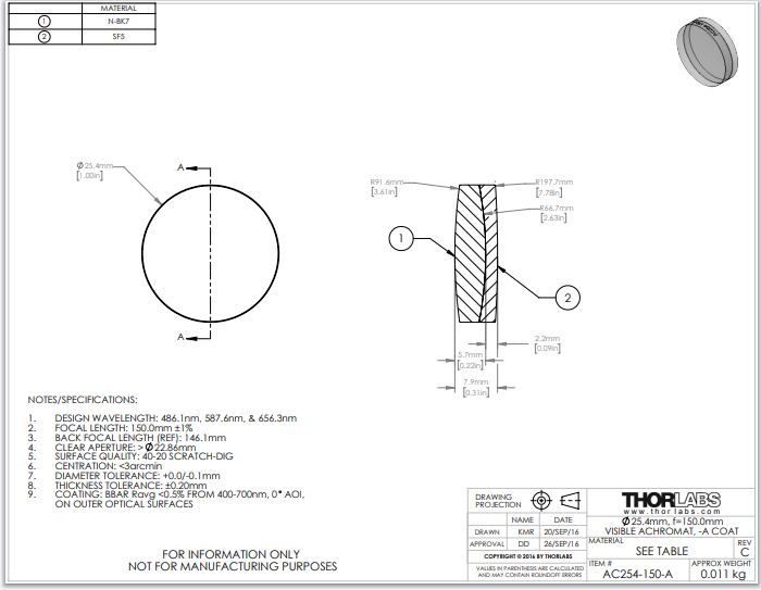 Thorlabs索雷博 AC254-150-A 消色差双胶合透镜