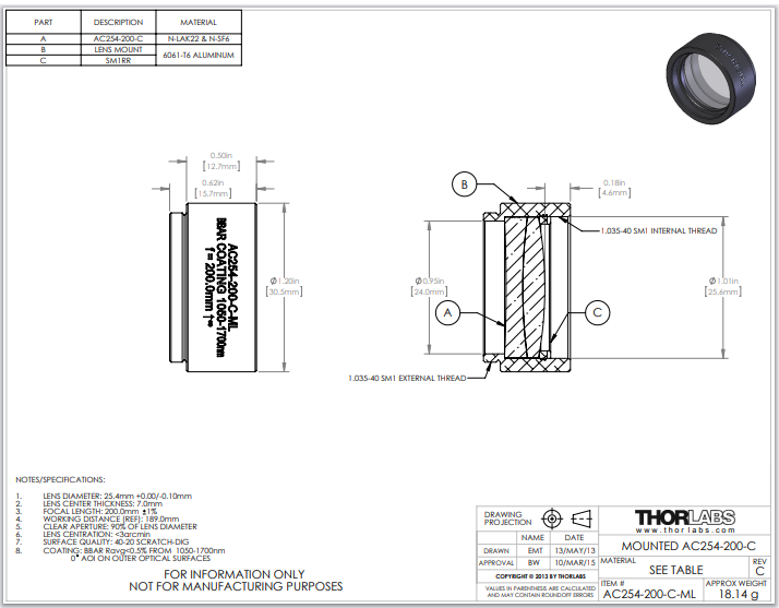 Thorlabs索雷博 AC254-200-C-ML 消色差双胶合透镜