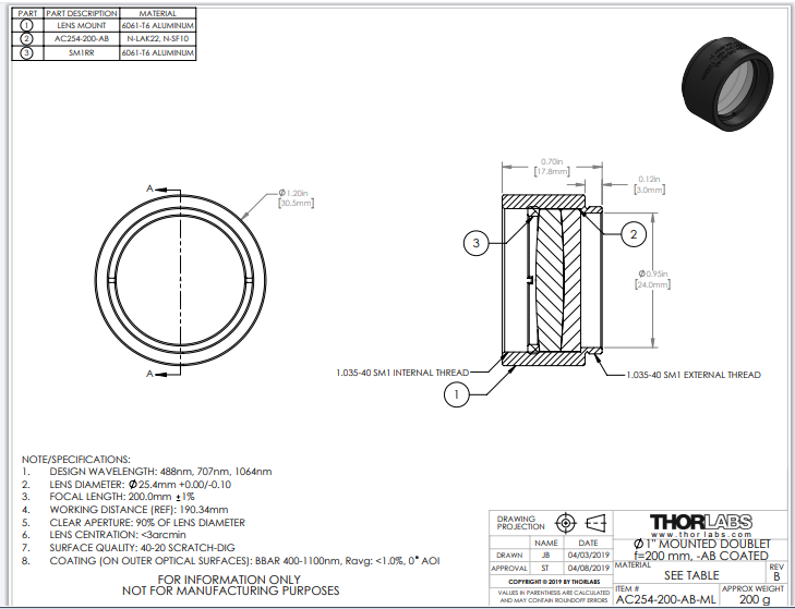 Thorlabs索雷博 AC254-200-AB-ML 消色差双胶合透镜
