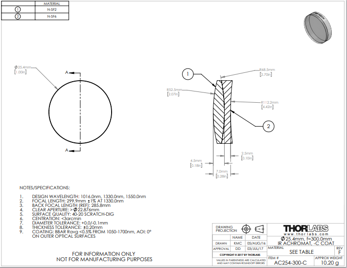 Thorlabs索雷博 AC254-300-C 消色差双胶合透镜