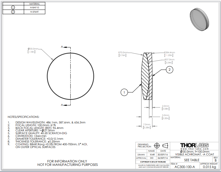 Thorlabs索雷博     AC300-100-A   消色差双胶合透镜