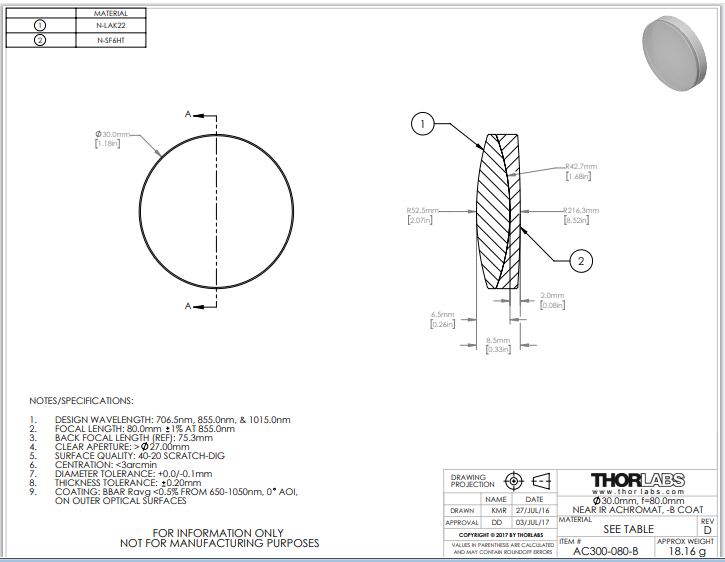 Thorlabs索雷博 AC300-080-B 消色差双胶合透镜
