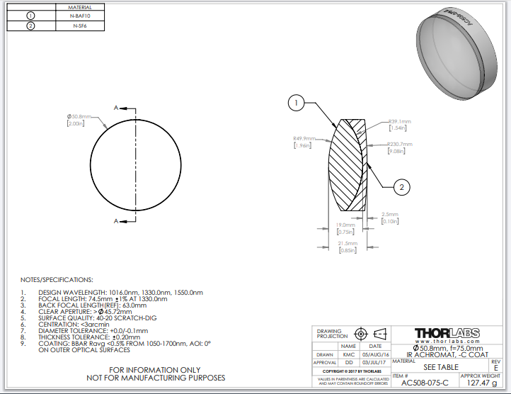 Thorlabs索雷博 AC508-075-C 消色差双胶合透镜