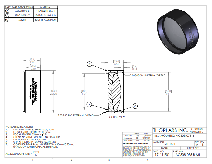 Thorlabs索雷博     AC508-075-B-ML   消色差双胶合透镜