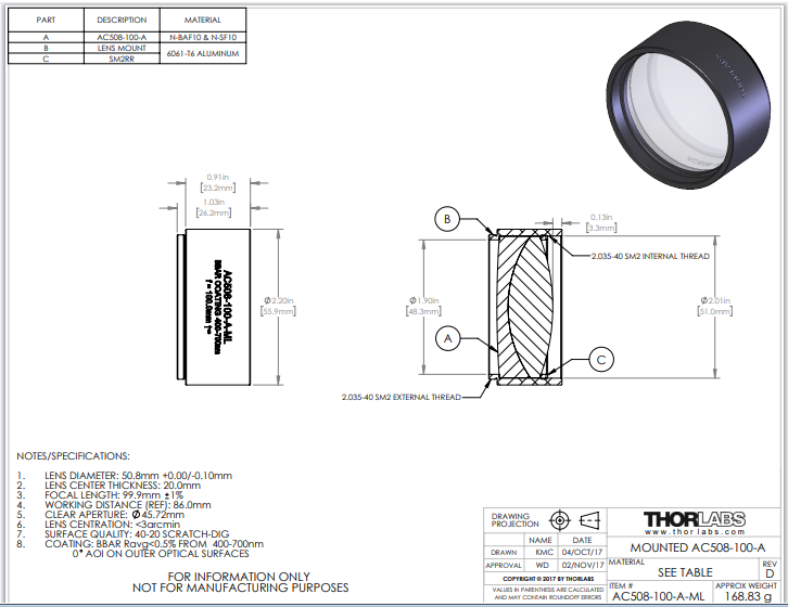 Thorlabs索雷博     AC508-100-A-ML   消色差双胶合透镜