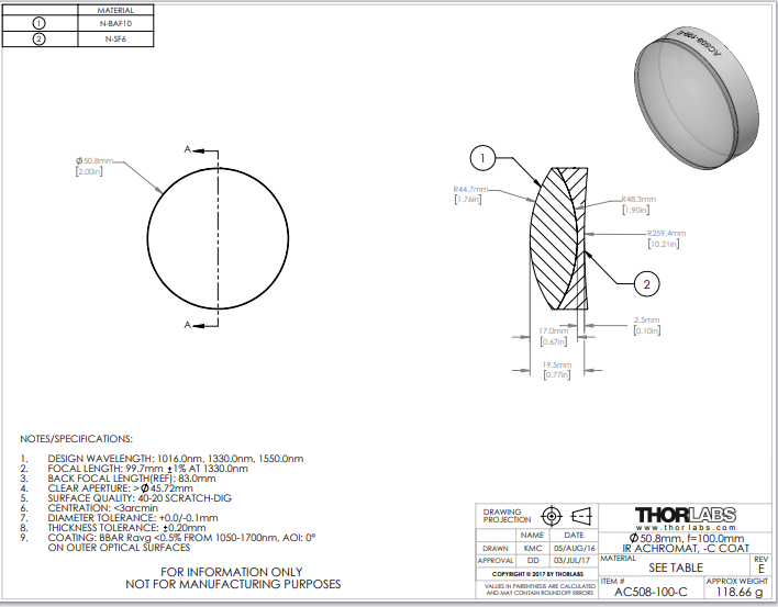 Thorlabs索雷博     AC508-100-C   消色差双胶合透镜