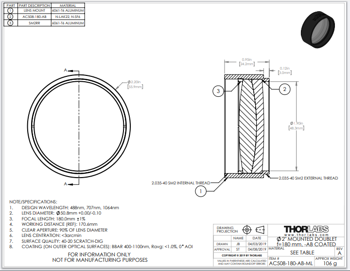 Thorlabs索雷博 AC508-180-AB-ML 消色差双胶合透镜
