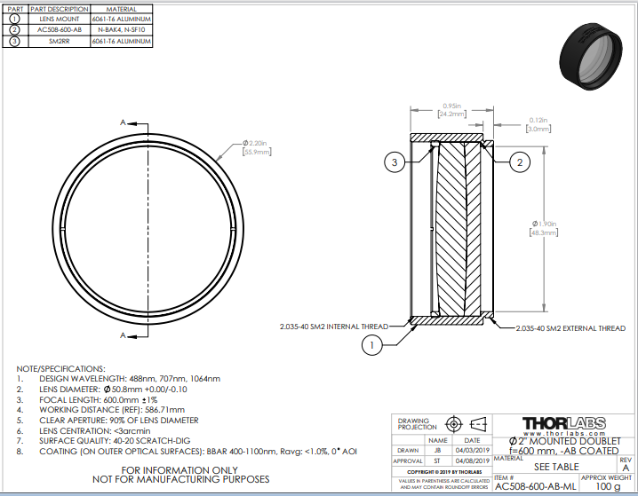Thorlabs索雷博     AC508-600-AB-ML   消色差双胶合透镜