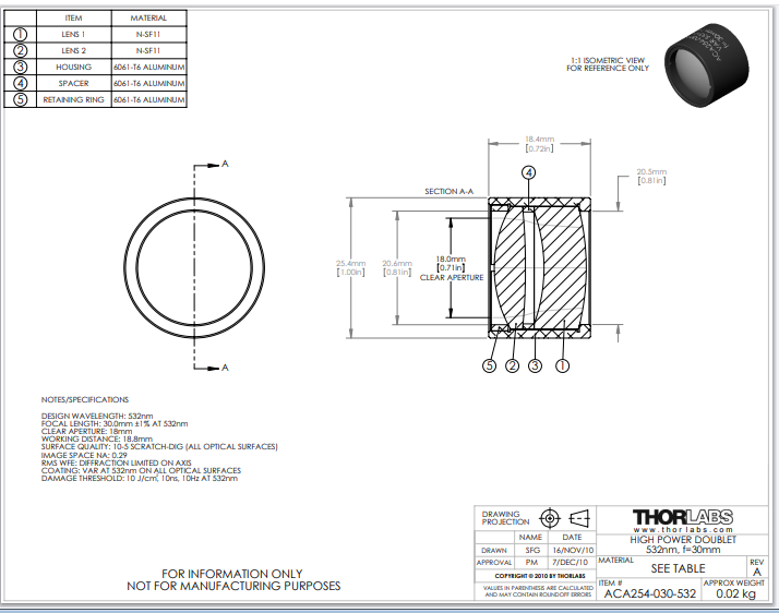 Thorlabs索雷博 ACA254-030-532 高功率空气间隔双合透镜
