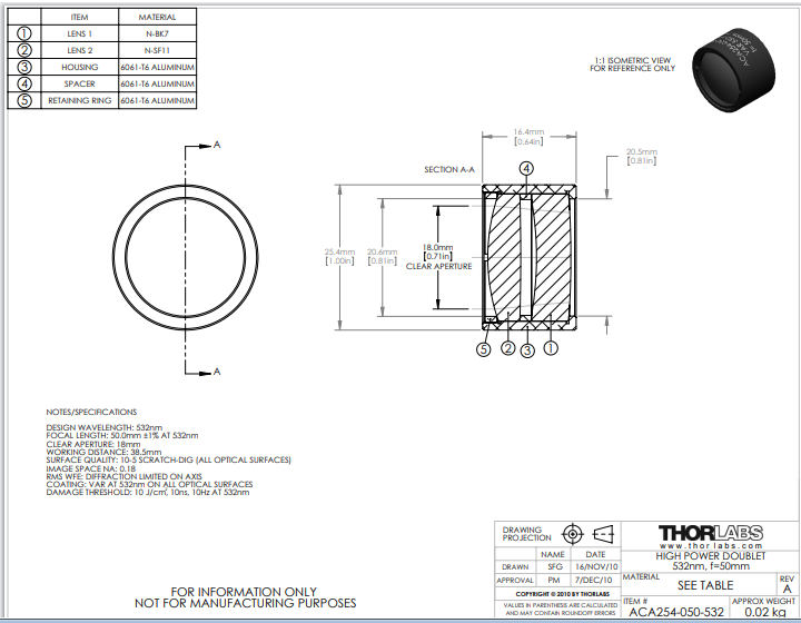 Thorlabs索雷博 ACA254-050-532 高功率空气间隔双合透镜