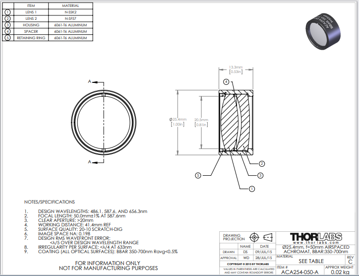 Thorlabs索雷博 ACA254-050-A 空气隙消色差双合透镜