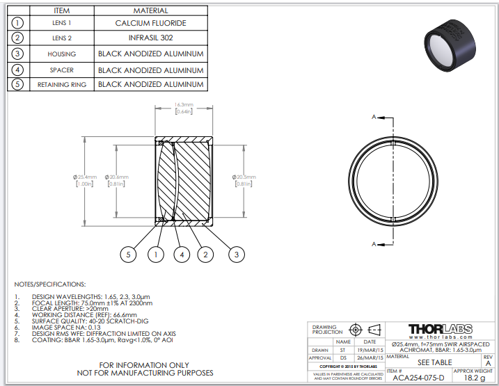 Thorlabs索雷博 ACA254-075-D 空气间隔消色差双合透镜