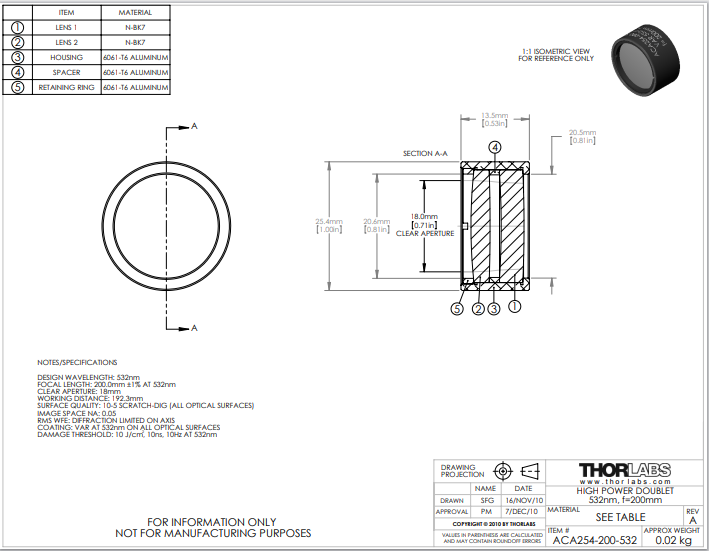 Thorlabs索雷博 ACA254-200-532 高功率空气间隔双合透镜