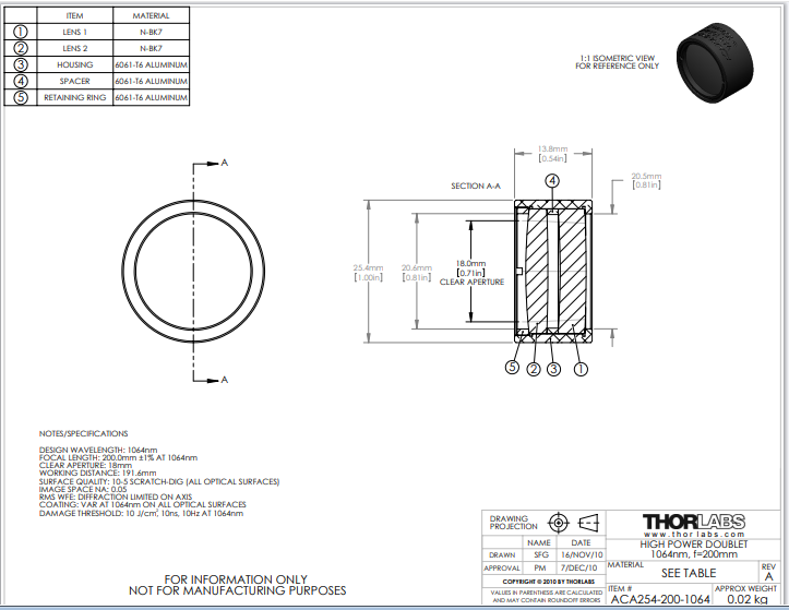 Thorlabs索雷博 ACA254-200-1064 高功率空气间隔双合透镜