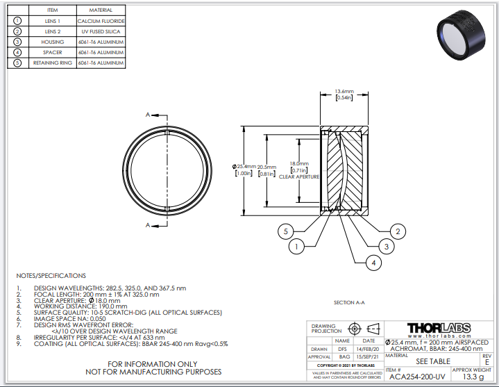 Thorlabs索雷博 ACA254-200-UV 空气间隔消色差双合透镜