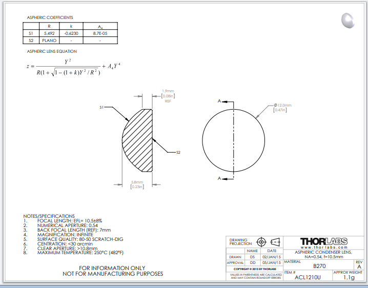 Thorlabs索雷博 ACL1210U 非球面聚光透镜