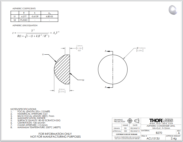 Thorlabs索雷博 ACL1512U 非球面聚光透镜