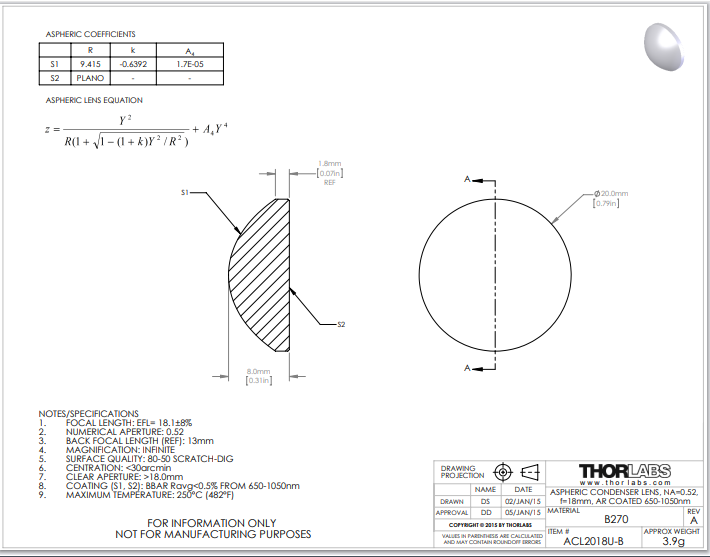 Thorlabs索雷博 ACL2018U-B 非球面聚光透镜