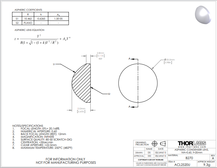 Thorlabs索雷博 ACL2520U 非球面聚光透镜