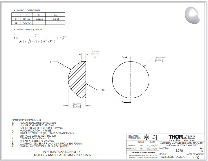 Thorlabs索雷博     ACL2520U-DG6-A   非球面聚光透镜
