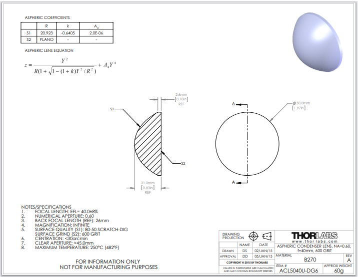 Thorlabs索雷博 ACL5040U-DG6 非球面聚光透镜