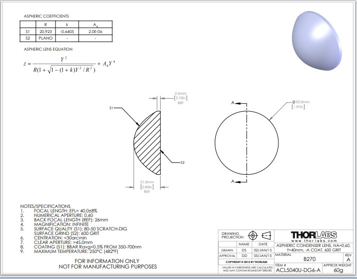 Thorlabs索雷博     ACL5040U-DG6-A   非球面聚光透镜