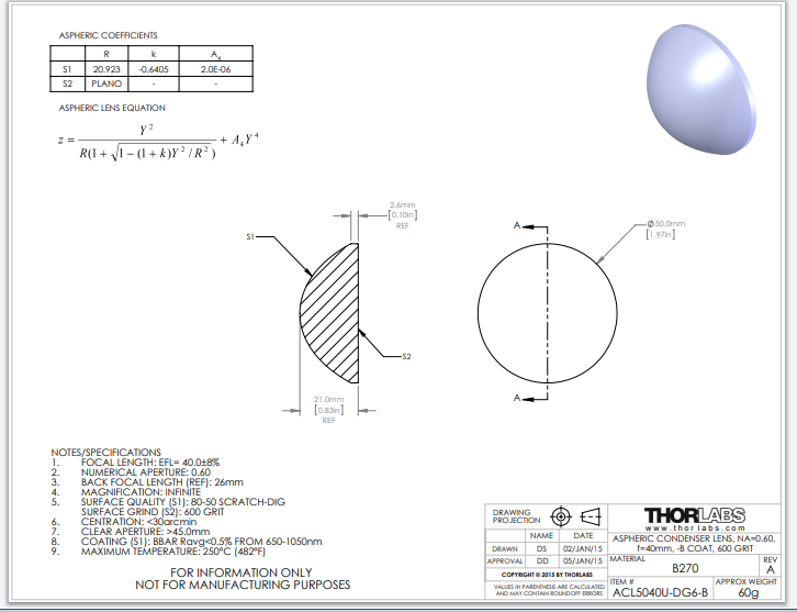 Thorlabs索雷博 ACL5040U-DG6-B 非球面聚光透镜