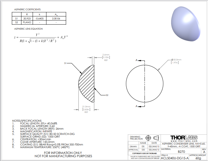 Thorlabs索雷博 ACL5040U-DG15-A 非球面聚光透镜