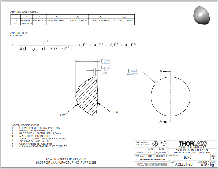 Thorlabs索雷博 ACL25416U 非球面聚光透镜