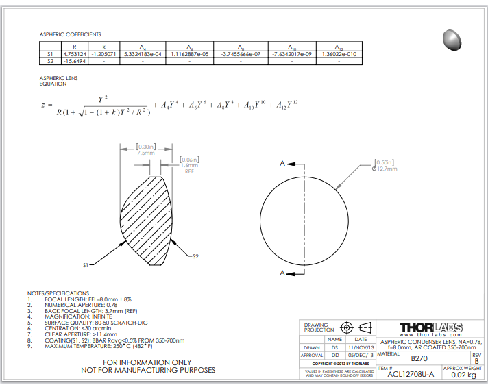 Thorlabs索雷博 ACL12708U-A 非球面聚光透镜