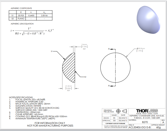 Thorlabs索雷博 ACL5040U-DG15-B 非球面聚光透镜