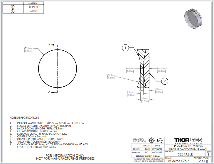 Thorlabs索雷博     ACN254-075-B   消色差双胶合透镜