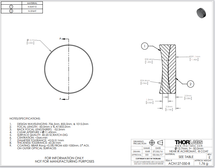 Thorlabs索雷博 ACN127-050-B 消色差双胶合透镜