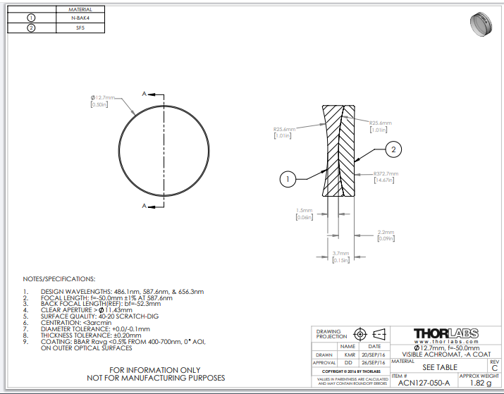 Thorlabs索雷博 ACN127-050-A 消色差双胶合透镜