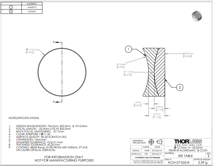 Thorlabs索雷博 ACN127-025-B 消色差双胶合透镜