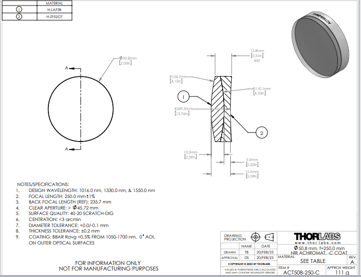 Thorlabs索雷博     ACT508-250-C   消色差双胶合透镜