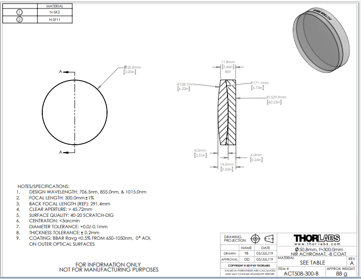 Thorlabs索雷博 ACT508-300-B 消色差双胶合透镜