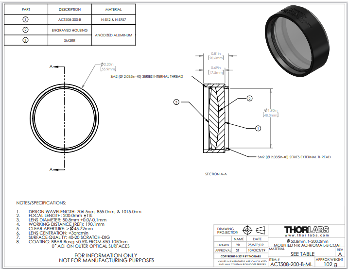Thorlabs索雷博     ACT508-200-B-ML   消色差双胶合透镜
