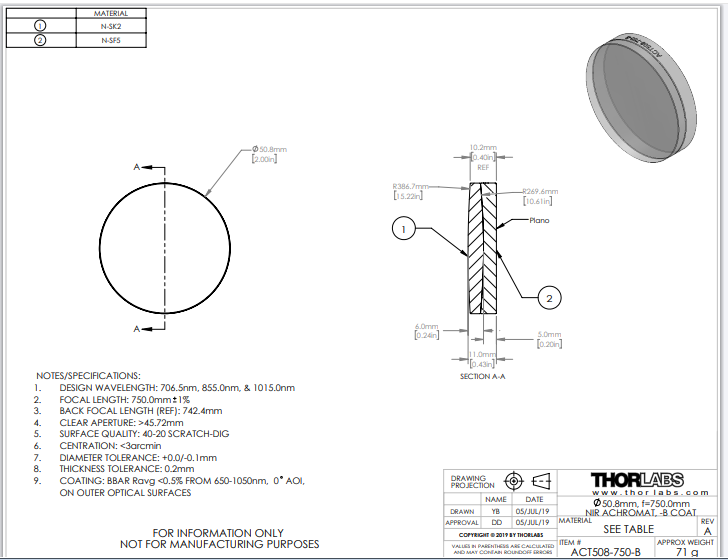 Thorlabs索雷博 ACT508-750-B 消色差双胶合透镜