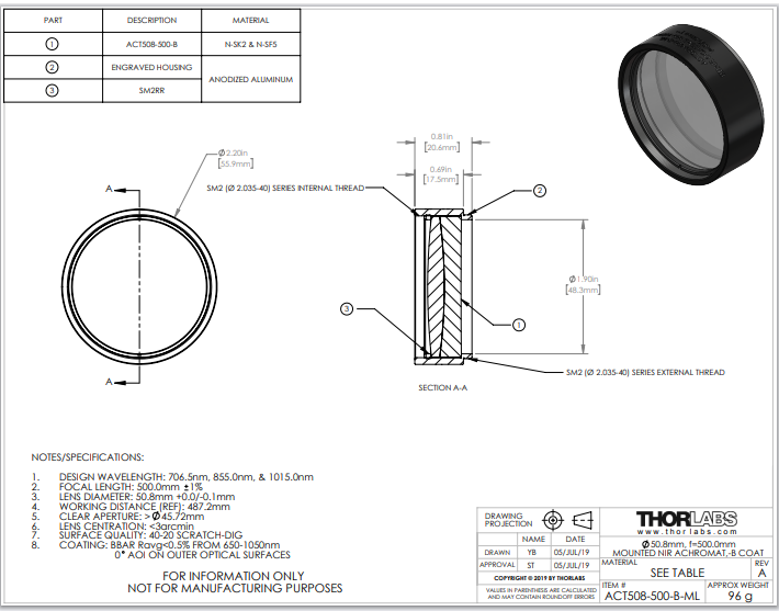 Thorlabs索雷博     ACT508-500-B-ML   消色差双胶合透镜