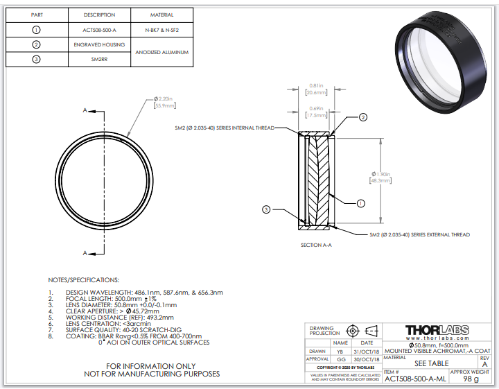 Thorlabs索雷博     ACT508-500-A-ML   消色差双胶合透镜
