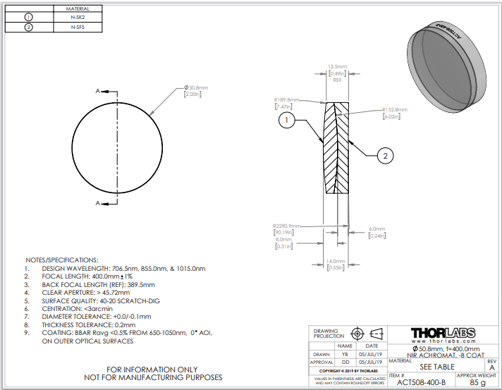 Thorlabs索雷博 ACT508-400-B 消色差双胶合透镜