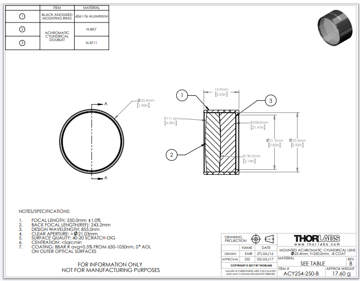 Thorlabs索雷博     ACY254-250-B   柱面消色差透镜